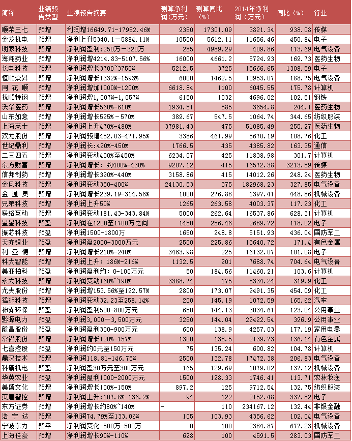 长电科技连续两个报告期净利润增幅超10倍,公司预计一季度净利润同比增长3700-3750%,2014全年实现净利润1.57亿元,同比增长1308.59%。顺荣三七预计一季度净利润同比增幅高达16649.71-17952.46%,去年净利润同比增长938.08%。金龙机电预计今年首季净利润同比增长5340.1%-5884.11%,去年净利润同比增幅达450.54%。此外,明家科技、海翔药业、恒顺众昇、同花顺、抚顺特钢预计一季度净利润增幅超10倍,去年净利润同比翻番。