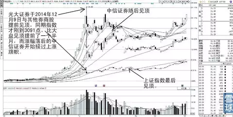 很明显,光大证券在2014年12月9日那天就跟大部分中小市值的券商股集体到顶了,而此时上证指数最高才到3091点,离调整的阶段高点——2015年1月23日的3406.9点,提早了一个半月,大盘涨幅还差10%,只有明智的人才会通过提前离场,来规避下跌30%的短期风险。如图4: