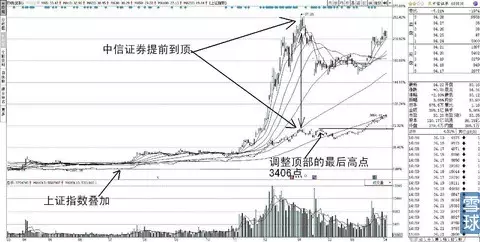 2015年1月7日,中信证券先行冲顶至37.25元,带动指数上冲至3374.9点,随后进入大幅下挫,而上证却在银行股的接力上行作用下,稍微下调即再创新高,于2015年1月23日达到3406.9点,落后中信顶十几个交易日才开始见顶并真正进入调整节奏如图3: