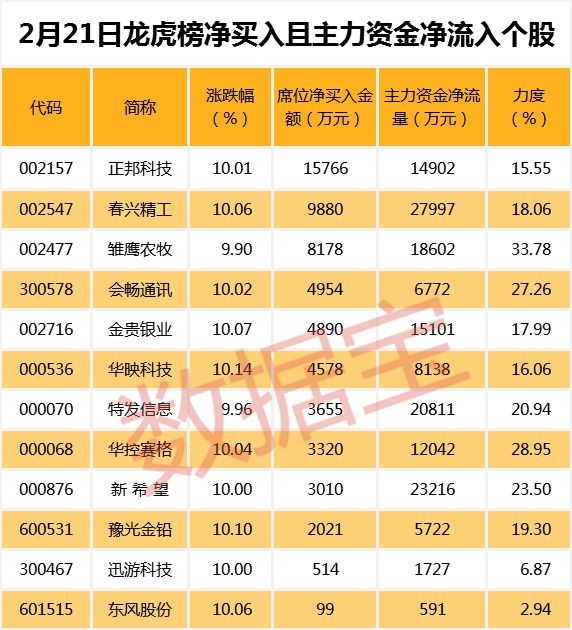 2月21日龙虎榜中机构及营业部席位资金净买入5.61亿元,其中净买入的个股有15只;净卖出的个股有13只。净买入前三名个股分别是正邦科技、春兴精工、雏鹰农牧,净买入金额占当日成交额比例达16.46%、6.37%、14.85%。