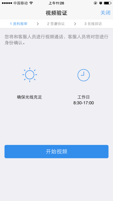 客户确保手机摄像头、麦克风正常,点击“开始视频”,进行视频验证过程中,客户需手持身份证,将正反面依次靠近摄像头,确保视频见证人员能够清晰辨认客户信息,见证过程中视频见证人员会对客户进行相关提问。