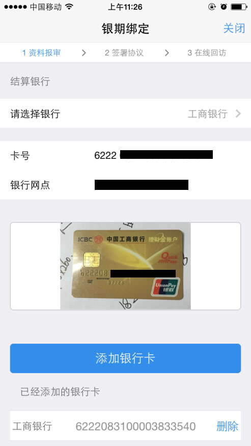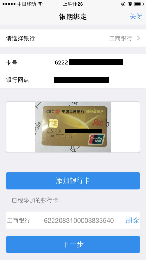 客户可以选择一家或多家结算银行,并正确填写相应的银行卡号和银行网点信息,上传银行卡照片,点击“下一步”。