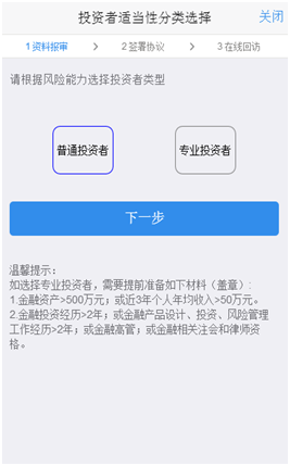 如果客户选择专业投资者,需要签署专业投资者附加协议;若选择普通投资者,需要签署普通投资者附加协议;若为普通投资者且风险等级为C1、C2或者风险等级为C3且选择金融账户,还需要签署普通投资者风险警示书(协议)。若协议全部签署后,点击“下一步”进入到在线回访步骤。