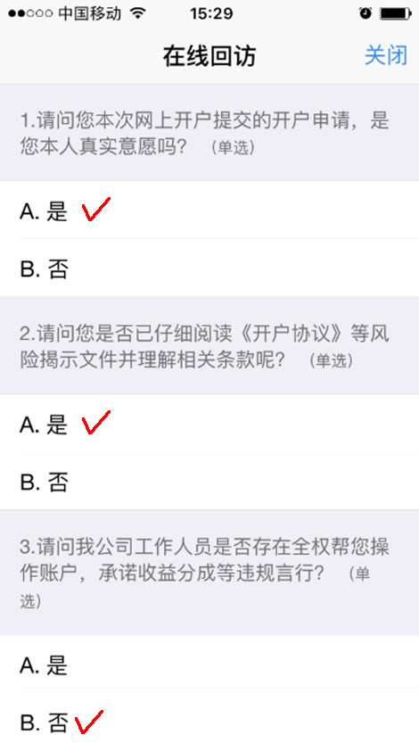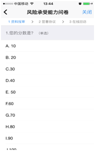 此步骤是了解客户的基本情况和投资意向等重要的信息,题目内容是由期货公司根据需要制定的,客户只需根据自身实际情况选择即可。风险承受能力问卷界面如图所示: