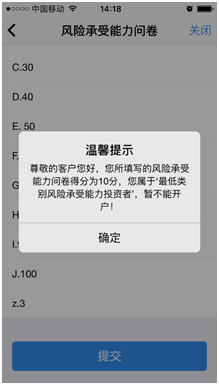 点击“提交”,提示当前评测结果,风险承受能力评测结果如图所示: