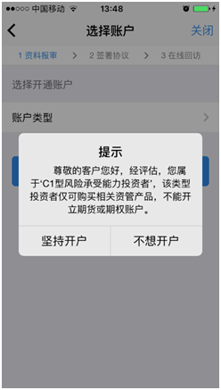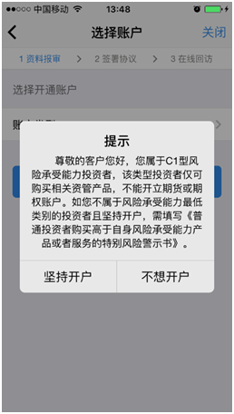 进入账户选择界面,若是普通投资者,针对风险等级为C1、C2、C3有两次告知,C1、C2等级第一次告知如图所示:
