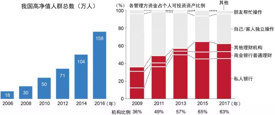 2016年,客户可投资资产达到1000万以上的数量达到158万人次,同时,根据现有资料显示,高净值人群对专业机构的依赖度不断提升。由于市场波动以及投资品种的复杂化,高净值人士愈发认同专业机构的价值,希望借助财富管理机构的信息渠道和资源获取更好的投资机会和建议。然而,大部分高净值人群对私人银行等机构的信任度更强,其拥有的高净值人群占据财富管理市场的半壁江山。