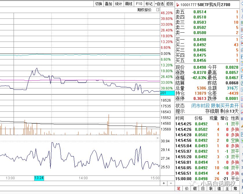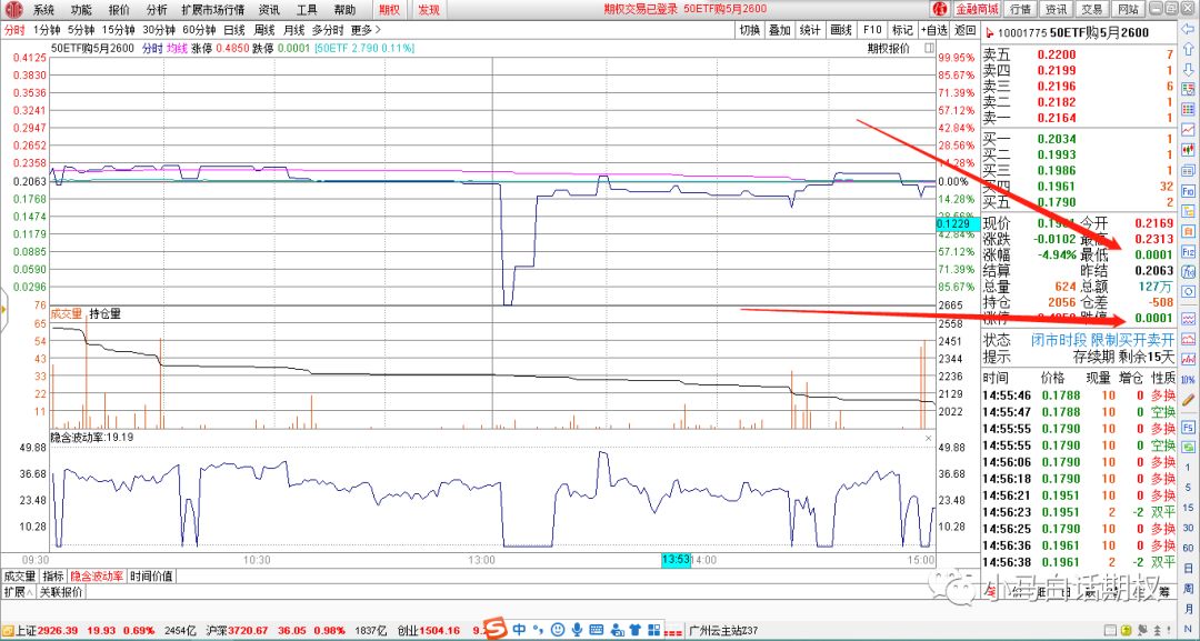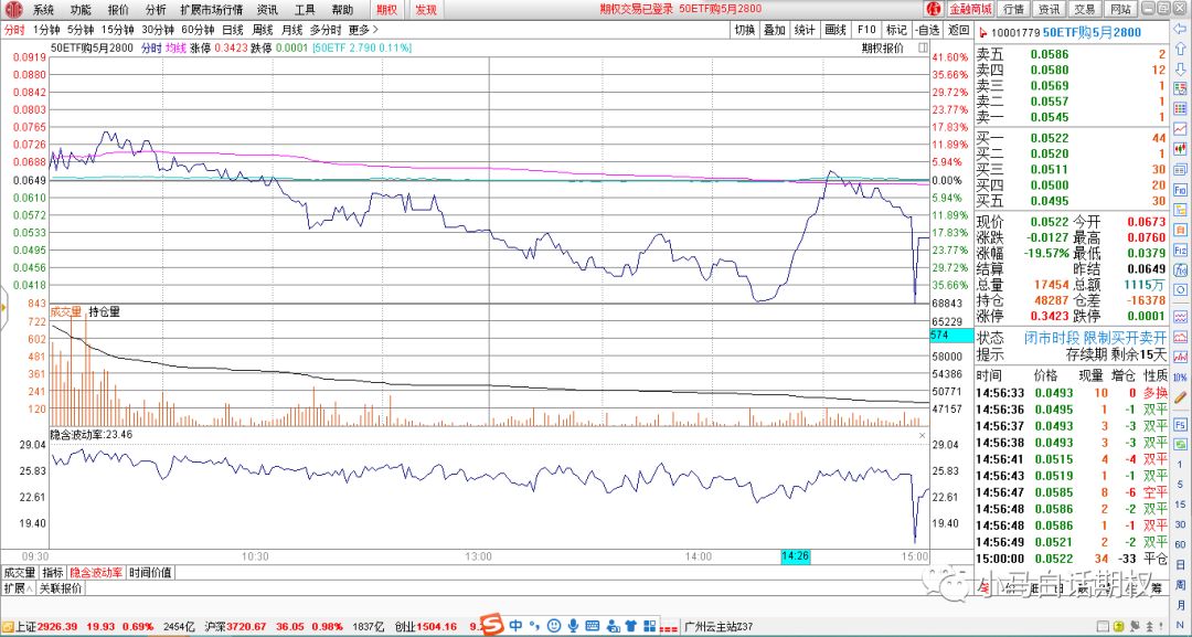 如下图这样的平值期权,下午基本没什么交易,原来的买方觉得刚好是平值附近,可能还有机会不想平仓,原来的卖方觉得在时间上占优势,也不想平仓。
