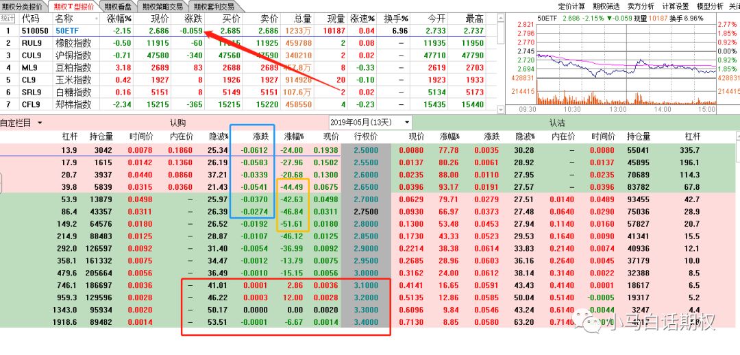 红色框的极度虚值认购期权3000以上,不跌反涨,蓝色框的实值认购期权跌幅较大,甚至深度实值认购的下跌金额比标的下跌的金额还要多,再看黄色框里,下跌的比例不一,不成阶梯式排列。