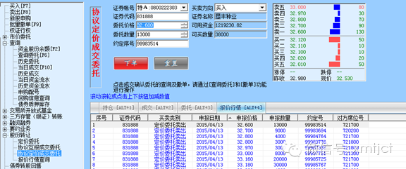 一种是“成交确认委托和互报成交确认委托”在这种交易委托模式下,交易双方在私下商量好以后,在系统中点对点的成交,通过互相确认委托的方式达成交易,其它第三人无法参与其中。