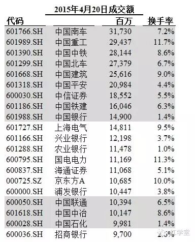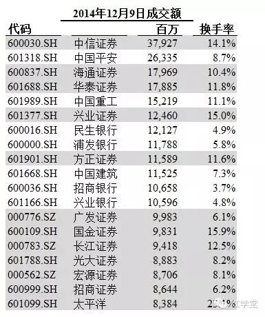 一路拿券商的朋友一定不会忘记去年12月9日(不少被套牢的朋友正是当天入场)天量成交中,券商的成交额换手率领先群雄。下图见去年12月9日排名前20成交额的个股: