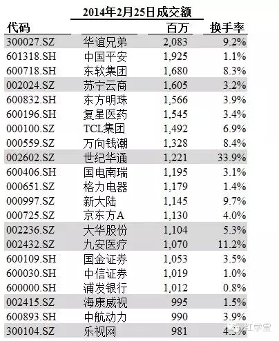 如不服,再看去年2月25,喜欢玩创业板的老股民(现在股龄一年以上的可算老股民了)应该记得,那是创业板/中小板成交额纷纷创历史新新高的日子。尽管区区500/900亿成交额在近半年的天量中被屡次打破。但从去年2月25日起,中小板/创业板在2013年的翻番行情后却迎来了一波长达半年的牛市中的“喘息期”,指数下跌超过15%。让我们看当日的成交额排名前20: