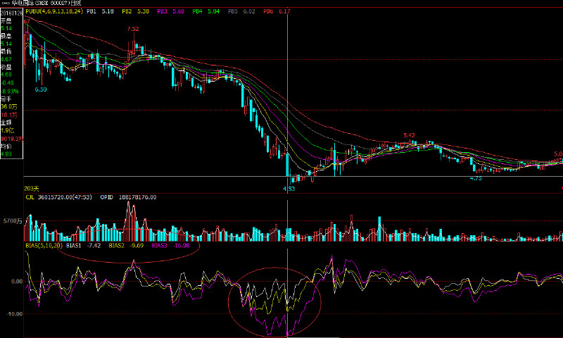 从华电国际的走势图中我们看到:在股价急剧下跌过程中,BIAS处于负值,在底部时BIAS(20)处于极值-17,且不断撞底(图中圆圈内)。市场处于超卖状态,也就是市场超冷, BIAS发出买入信号,这时买入将有利可图。