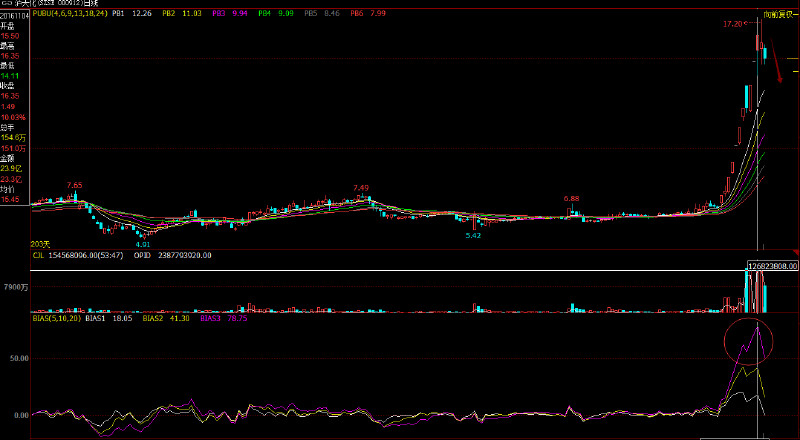 从泸天化的走势图中我们可以看到:股价不断走高,市场交投过于活跃,市场处于严重超买行情。BIAS不断走高,发出卖出信号,在图中圆圈中达到极值,这时股价需要回调。BIAS发出的卖出信号是很准确的。