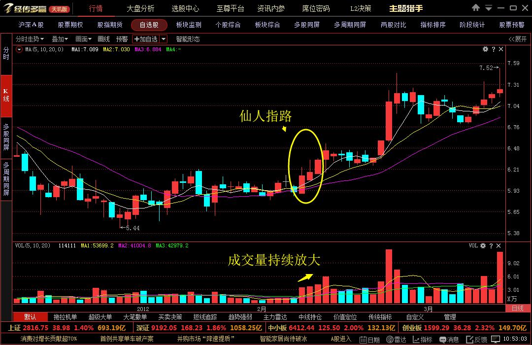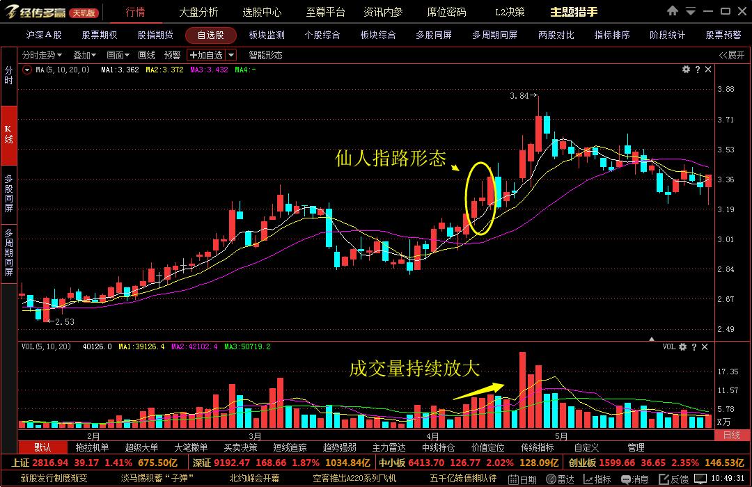(4)仙人指路形态形成过程中,成交量要呈放大态势。