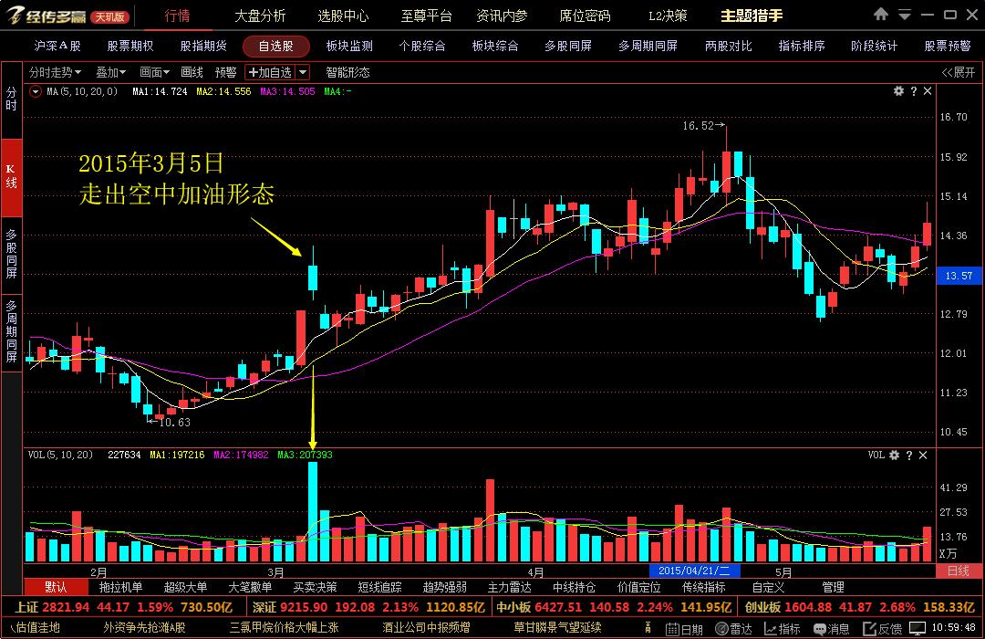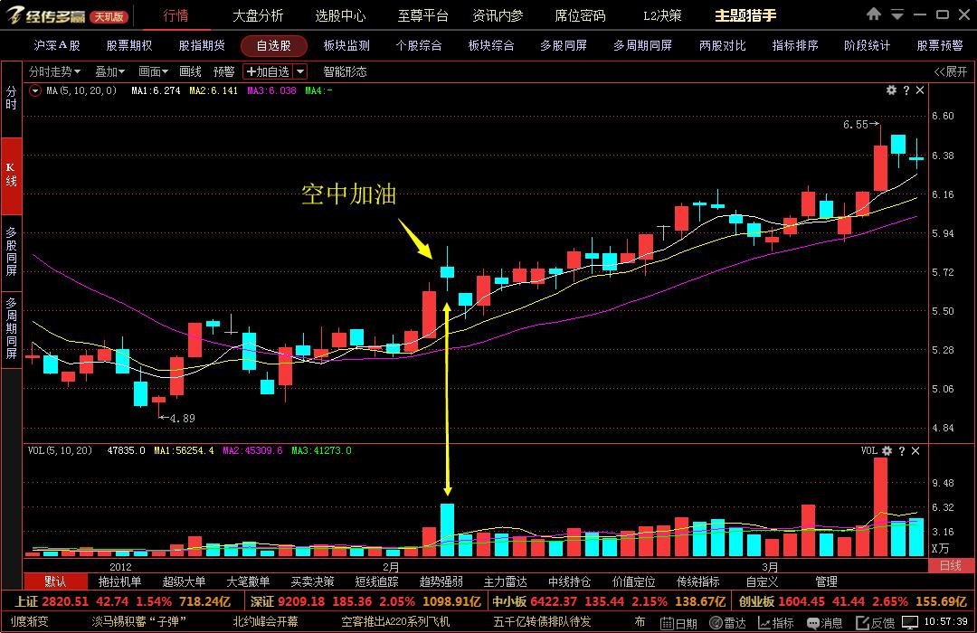 (4)空中加油形态出现当日,成交量要比前几日放大数倍,且次日成交量又回归到正常水平。
