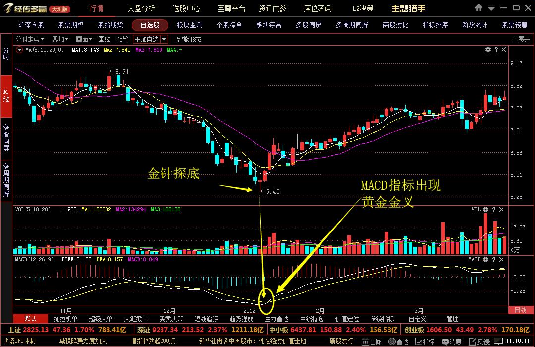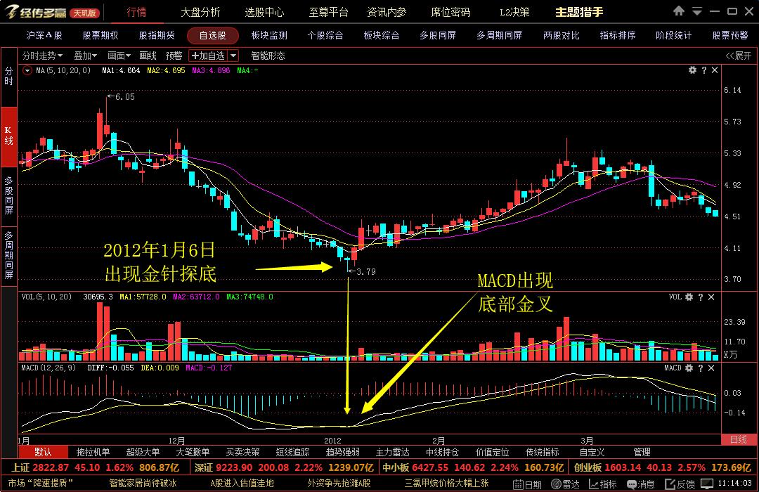 2012年1月6日,万业企业的股价经过了一波下跌之后,以向下跳空的形式开盘,接着不断创出新低,其后,多头开始发力,股价最终以十字星线报收,形成了金针探底形态。这说明空头力衰,多头即将发力。投资者观察此时的MACD指标可知:该指标此时出现了底部黄金交叉,这也预示股价将上涨