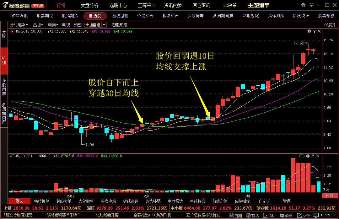 (1)某一日股价自下而上穿越30日均线, 随后并未持续.上涨而是向10日均线靠拢。