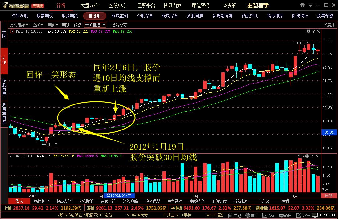 回眸一笑,是指股价K线自下而上穿越30日均线后出现回调,当股价K线回调到10日均线位置时,因受10日均线支撑再度上涨。该形态属于上涨中继形态,预示后市还将继续上涨,如图4-1所示。