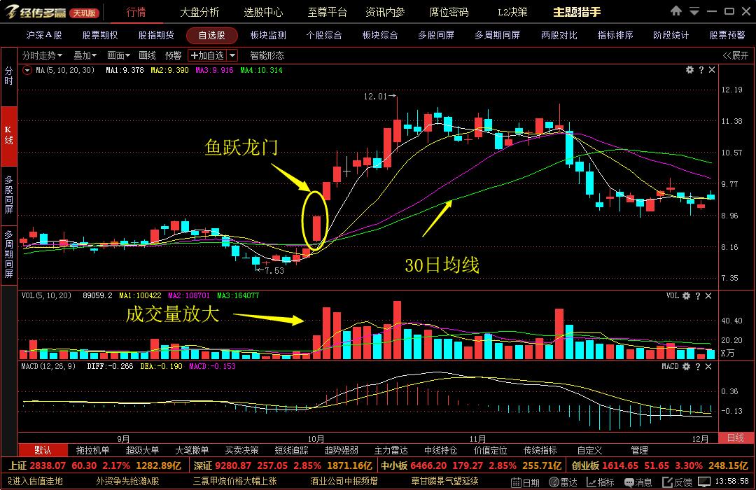 第一,某一日股价放量跳空.上涨,并且直接越过30日均线。