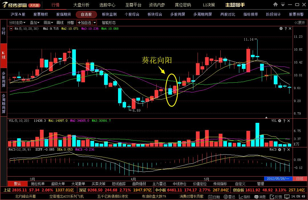 如图6-2所示,中国平安的股价经过一波下跌后,从2012年4月初重新开始上涨,且在上涨途中走出来葵花向阳形态,预示股价将继续上涨。