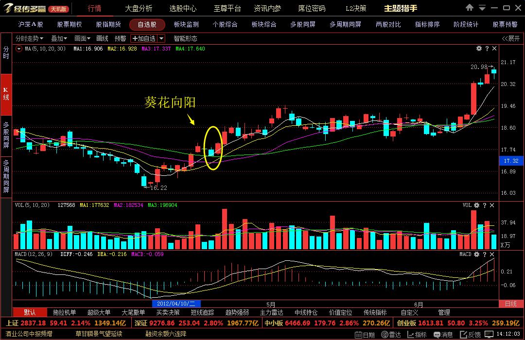 4月17日,中国平安的股价出现了回调走势,全天震荡走低,并最终收出了一根中阴线,表明行情有向坏的可能。次日,该股高开高走收出一根中阳线,且这根阳线的收盘价位于前一根阴线的开盘价之上,这表明葵花向阳形态正式形成,未来股价还将进一步上涨。投资者观察此时的MACD指标可知:该指标此时同步自底部上涨并上穿0轴,这也预示股价将上涨。