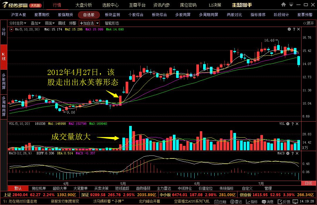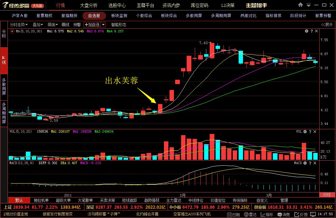 出水芙蓉,是指股价K线在盘整过程中,各条均出现黏合状,某日股价大幅上涨,拉出一根大阳线,且此阳线一-举突破多条均线。该形态属于强烈的看涨形态,很多强势股在上涨启动期都出现过此种形态,如图7-1所示。