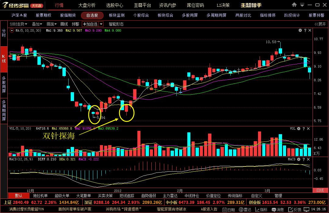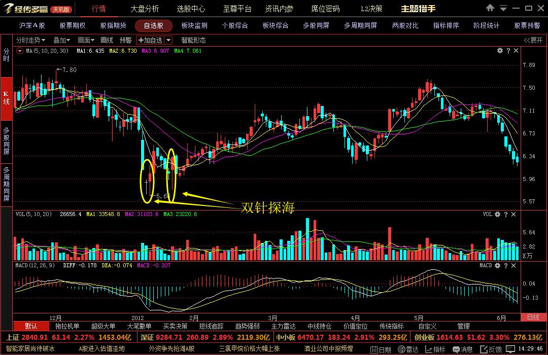 第一,两根下影线的低点。双针探海形态要求后一根下影线的低点要高于前一根下影线的低点,即使只差一分钱也可以。