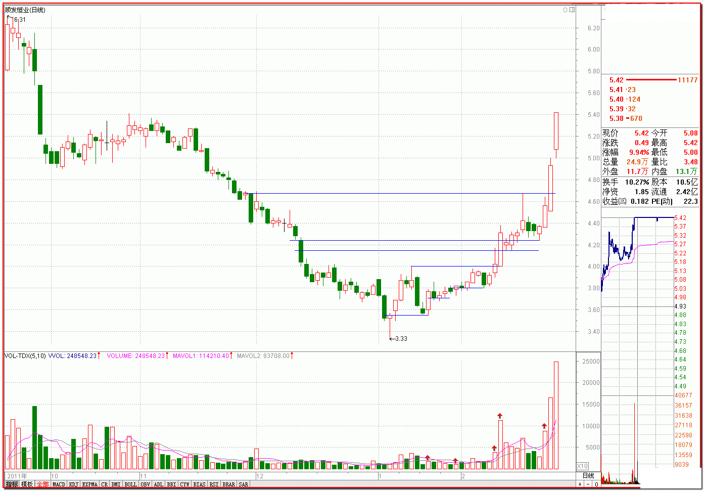 就是这么一个简简单单的“小倍阳”,活像一个“密探”,它一出场,庄家或主力的隐私就暴露无遗了。在哪里建仓,在哪里加仓,在哪里洗盘,在哪里增仓,在哪里启动,在哪里拉升,我们可以看得一清二楚。若是结合其它的量柱形态呢?其威力不是更加惊人吗?答案是肯定的。 正是从这种意义上讲,量柱就是股市密探。按照这幅图的指引,凡是在“小倍阳”出现的当日介入,你不会有任何套牢之苦;若是结合“三句话”适时抛出,你会吃足整整五个波段的利润。
