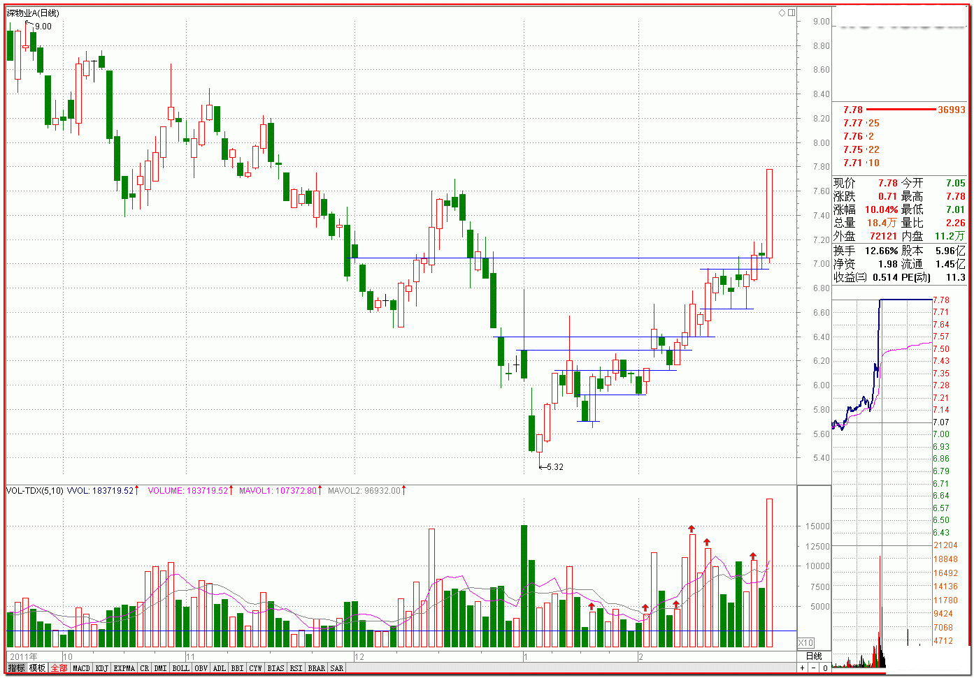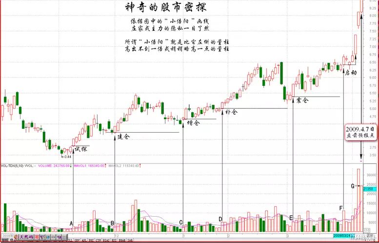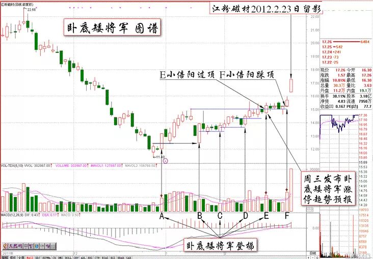 图中有ABCDEF共6个卧底矮将军(其中AEF是小倍阳,BCD是单阳盖阴)。 先看A处左侧,根据“卖在买先”的规律,无人卖时,必然无量,其左侧长期大跌自然形成“百日低量群”。因为价位太低无人卖,所以主力把价位稍稍提升一下,A量柱就上来了,形成一根“价柱很长,量柱很矮”的“长阳矮柱”。我们就是在A柱次日(2012.1.4日周三)发布了盘前预报。 我们为什么发布预报?因为这根“长阳矮柱A”是“长长的价柱对应矮矮的量柱”,股价一涨再涨,而量能不能放大,说明这个价位不能激发持股者的“卖出欲望”,必然还有更高的价位等着。于是,此后果然连拉五阳,回调一日后,B处又是一根“长阳矮柱”。 B柱比A柱的质量更好!因为其价柱更长,量柱更矮。说明了什么?根据“价在量先”的规律,说明价格涨了,量能缩了,后面必然还要“涨价 ”。
