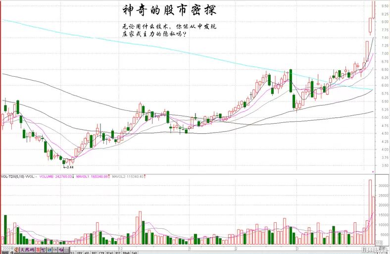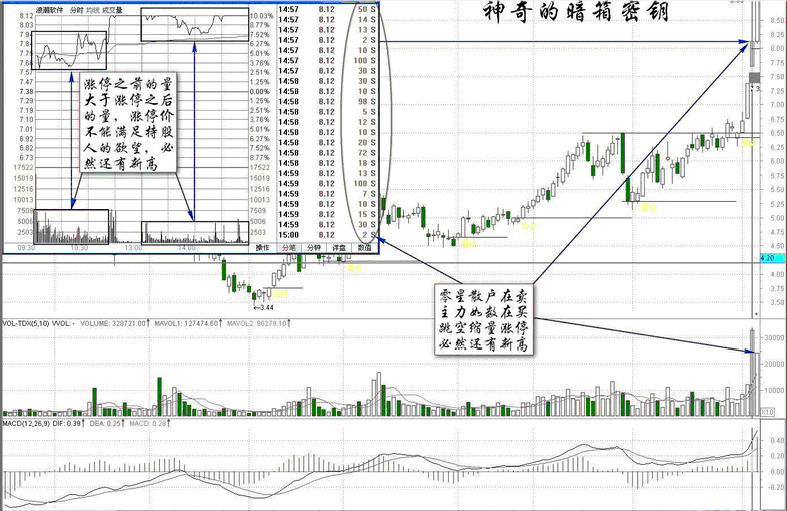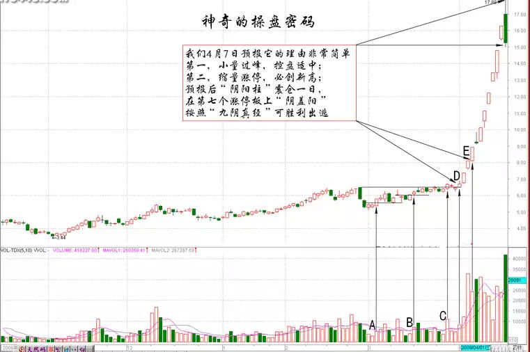 先看图中ABD三根量柱,都是“小倍阳”,它们比其左侧的量柱“高出不到一倍”,其对应的价柱却上升了一个台阶,这叫做“小倍阳搭台”;如果我们以D柱的实底画一条水平线,刚好与其左侧的“大阴实顶”持平,显然D柱是“小倍阳踩顶”;再看C柱,明显是“双倍阳过顶”。以上这些都是“涨停基因 ”,当“涨停基因”按某种规律组合,就成了“涨停密码”;E柱是我们发布预报的日子,当时发现该股有“A小倍阳搭台” “C双倍阳过顶” “D小倍阳踩顶”的三重组合,又添加了“E缩量涨停”这个基因,这么多涨停基因几乎同时出现,说明主力控盘很好,意在高远。于是,我们以E柱的实顶8.08元预测其涨幅将会翻番,达到16.16元左右(测幅方法详见《量柱擒涨停》),此后验证,该股有效最高价为16.28元,与预测基本吻合。有许多网友实盘参与了该股,但是事后统计,一般都只是吃了一、两个涨停板,先后获利出局。最多的一位网友吃了四个涨停板,还是漏掉了三个。能不能吃足吃够这七个涨停板呢?能!只要用“暗箱密钥”打开庄家或主力的暗箱,这七 个涨停板一个都不会少。