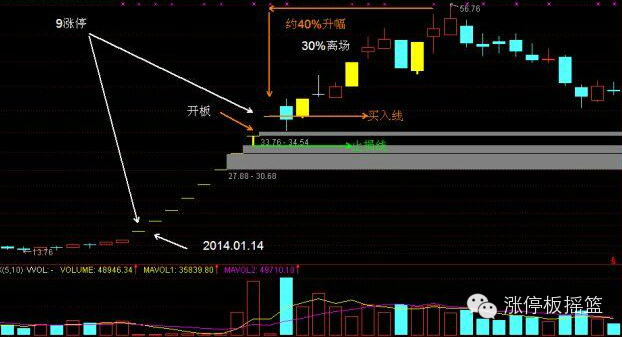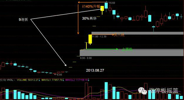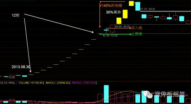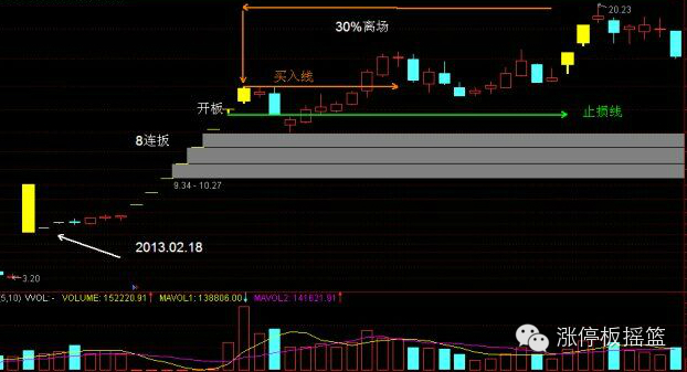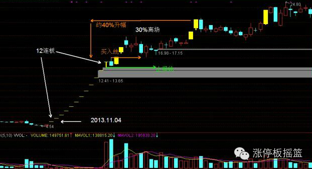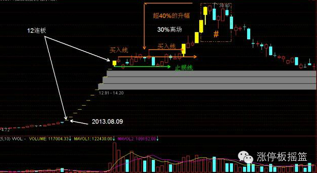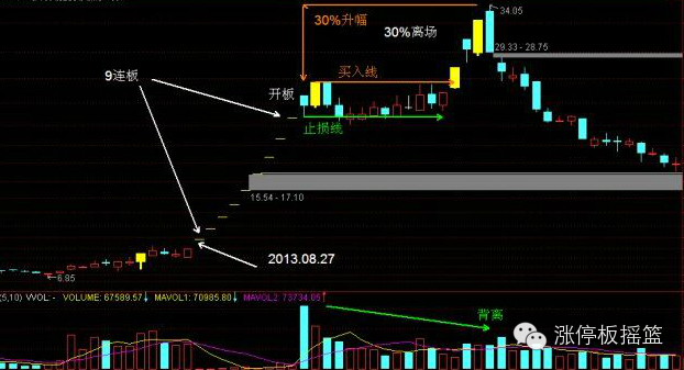 止损点:为避免诱多,必须设好止损点!以买入点K线前推最后涨板的低点为止损点。