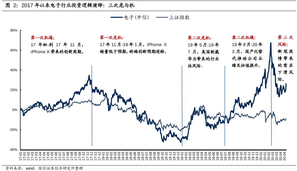 2017年以来电子行业发展逻辑过去三年发生了三次较大的变化。在每一次危与机的演绎过程中,有风险预期导致公募基金持仓的大幅下降,也有机会来临时公募基金的大幅加仓。我们通过对行业演绎逻辑的分析,总结为三次危与机: