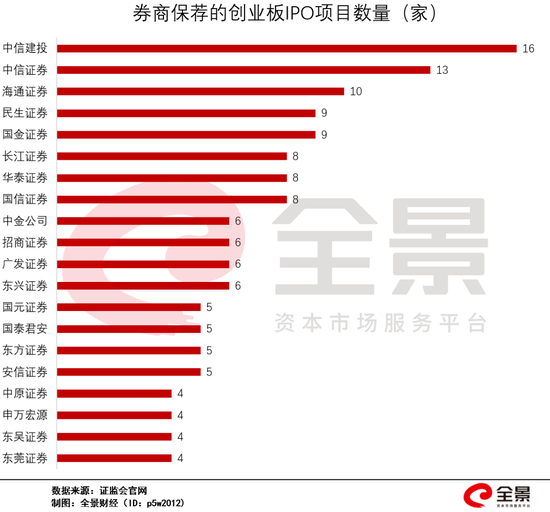 证监会最新数据显示,创业板IPO排队企业中尚未过会的184家。保荐企业数排名第一的是,中信建投(33.040, -0.37, -1.11%)证券,保荐项目数量达16家;排在第二的是,中信证券(22.610, -0.18,-0.79%),保荐13家;排在第3位的是,海通证券(11.730, -0.09, -0.76%),保荐10家。