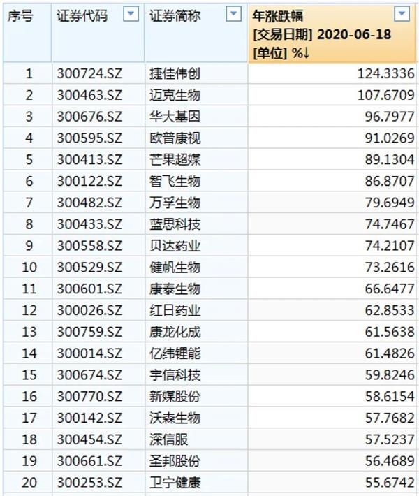 创业板指成分股今年以来涨幅排名,截至6月18日