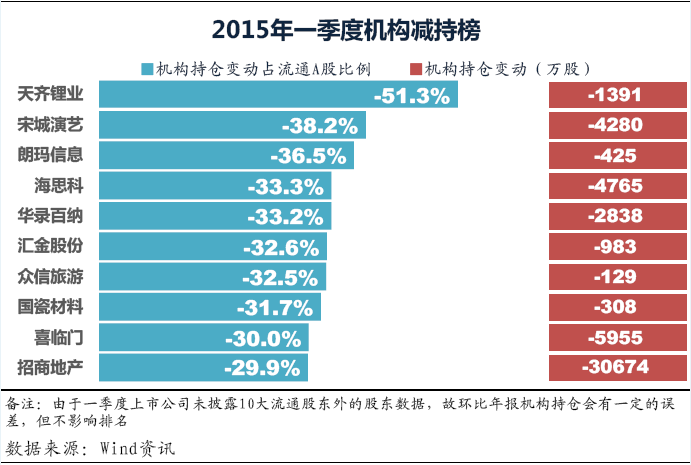 一季度机构共对1490只A股进行了减持,减持比例居前的10个股分别为:天齐锂业、 宋城演艺、 朗玛信息、 海思科、 华录百纳、 汇金股份、 众信旅游、 国瓷材料、 喜临门、 招商地产。具体如下图所示: