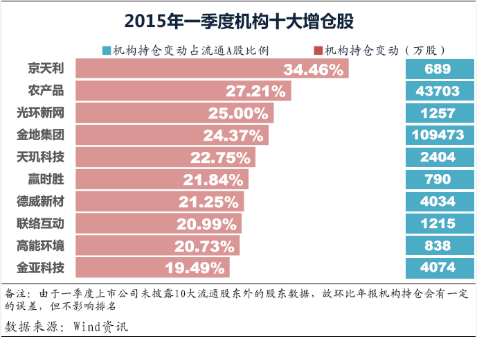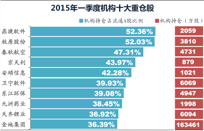 从机构持股变动来看,2015年一季度,共有709只个股受到了机构增持,其中增持比例居前的十只个股分别为:鼎捷软件、牧原股份、春秋航空、京天利、安硕信息、 卫宁软件、 东江环保、 九洲药业、 天齐锂业、 金地集团;具体增持比例如下: