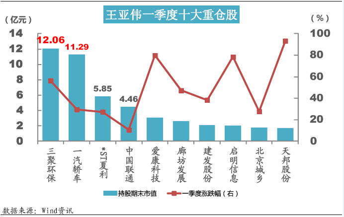 从布局看,一季度,王亚伟新买入了24只个股。其中对天邦股份增持数量占流通股比例达6.6%,一度超过了举牌的门槛;此外,王亚伟一季度增持了8只个股,分别为*ST夏利、一汽轿车、三聚环保、北京城乡、启明信息、 一汽富维、 中电广通、 福日电子;值得一提的是,8只增持个股有6只为北京本地股,并且*ST夏利、一汽轿车、一汽富维均为一汽集团旗下上市公司,显示王亚伟对一汽集团重组预期极为看好。