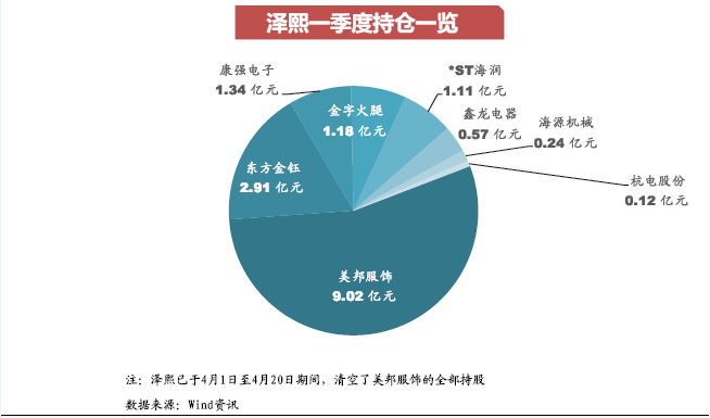 一季度期间,泽熙旗下产品共对3只个股进行了增持,分别是:*ST海润(1159万股)、海源机械(153万股)、杭电股份(51万股,次新股)。同时,将 铁岭新城、 东源电器、 赛象科技、建研集团、 东富龙、 宁波联合六只个股进行了清仓。