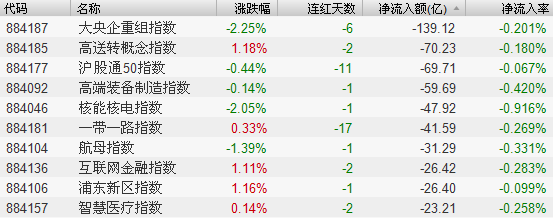 1.央企重组、沪股通50和核能核电等板块表现低迷,资金流出较为显著。