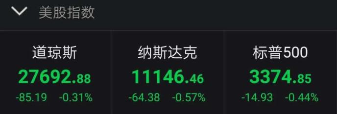 截至今日凌晨收盘,美股三大指数集体收跌。标普500指数收盘下跌14.55点,跌幅0.43%,报3375.23点;纳斯达克指数收盘下跌64.38点,跌幅0.57%,报11146.46点;道琼斯指数收盘下跌83.28点,跌幅0.30%,报27694.79点。