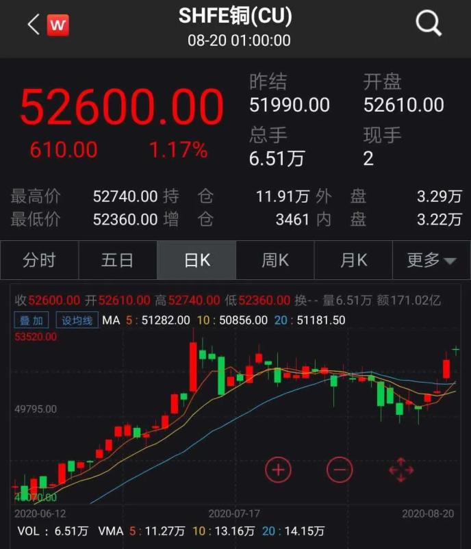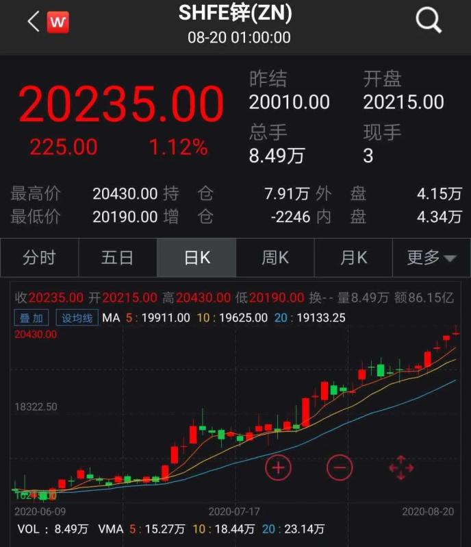 截至本周三,沪锌主力ZN2009合约盘中最高突破20140元/吨,创下年内新高。