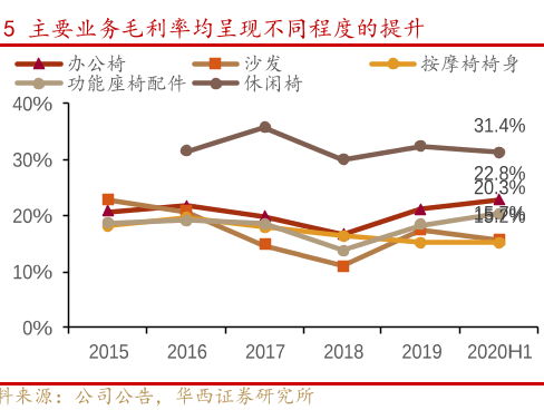 分业务来看,2020H1公司办公椅、沙发、按摩椅椅身、功能座椅配件、休闲椅等销售额分别为9.24、2.12、1.20、0.22、0.17亿元,同比分别+25.4%、-21.6%、14.0%、-20.1%、-14.3%。二季度以来居家办公需求凸起,办公椅需求爆发。公司方面,持续深化推行KAM大客户价值营销,不断提升在宜家、欧迪等大客户中的份额;其次,围绕“数一数二”战略,加快拓展欧洲、亚洲、澳洲、南美洲、非洲等市场重点新客户;第三,加快跨境电商业务发展,跨境电商目前已成为公司重要的外销业务渠道。行业需求爆发,公司加大拓展,上半年办公椅销售额同比增长25.4%,二季度预计增速更为显著。沙发受疫情影响,上半年销售额同比下降21.6%,预计随着海外消费市场逐步复苏,线下渠道陆续营业,沙发订单将逐渐好转,下半年沙发销售有望改善。盈利端:毛利率创近五年新高,净利率处于较高水平。