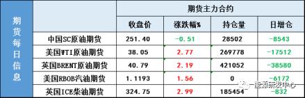 【1】WTI主力原油期货收涨1.02美元,涨幅2.77%,报38.05美元/桶;布伦特主力原油期货收涨0.87美元,涨幅2.19%,报40.79美元/桶;INE原油期货主力合约夜盘收跌0.51%,报251.4元/桶。