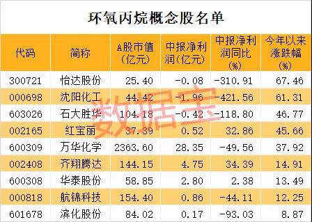 据了解,目前各公司订单饱和。业内人士认为,环氧丙烷下半年步入量价齐升阶段,行业三季度盈利或超预期。在8月初,受环氧丙烷价格大涨刺激,红宝丽一度在8月7日至8月11日连续拉出三个涨停板。滨化股份、航锦科技、怡达股份也在彼时快速上涨,在经过近一个月调整后,环氧丙烷概念股又重拾升势。昨日怡达股份一度涨停,红宝丽、滨化股份、万华化学、华泰股份等逆市飘红。