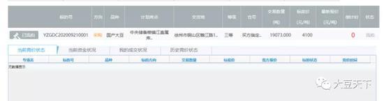 9月21日油脂公司国产大豆竞价采购专场,生产年限为2020年,数量为19073吨,本场报价递减度:10元/次,标的交收地为徐州,标底价为4100元/吨,全部采购失败。