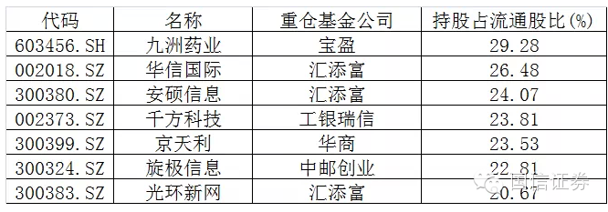 除表格中7家公司之外,另有甘肃电投、佳讯飞鸿、美盈森、浙江众成、津膜科技、信威集团、皇氏集团等多家公司被单一基金公司持股15%以上。