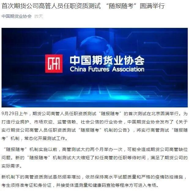 9月中旬,中期协发布《关于实行期货公司高管人员任职资质测试“随报随考”机制的公告》称,为积极支持行业发展、提升会员服务质量,同时为高管人员任职提供便利条件、满足期货公司实际需求,中期协将增加期货公司高管人员任职资质测试(简称“高管测试”)频率,实行“随报随考”机制,常态化开展测试工作。