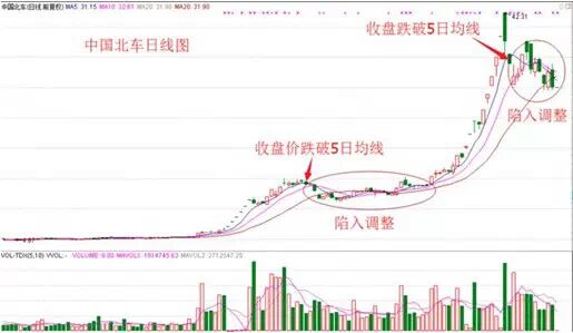 首先,怎么用均线判断行情是否健康呢?当股价跌破了近期一直受到支撑的均线就是不健康的信号。来看一下前面暴涨的中国北车(下图)。在下图中,收盘价跌破每次跌破五日均线,后面都陷入了调整,而在涨势中,股价一直受到五日均线的良好支撑,所以一旦跌破五日均线就是一个警惕信号,但是不可以当作一个趋势反转的信号,因为这仅仅是一个弱势信号。