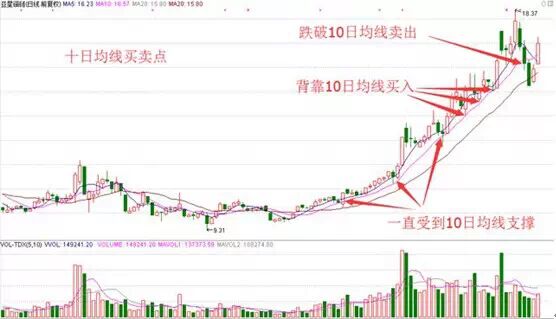 其次,怎么用均线作为买卖依据呢?均线就是一个移动的趋势线,当上涨趋势良好的时候,股价必然会沿着均线往上涨,这时候我就背靠一直受到支撑的均线买入,以跌破受到支撑的均线时卖出(如果没有脱离成本,就以下面一根均线作为止损,如10日均线买入就以20日作为止损位)。如下图: